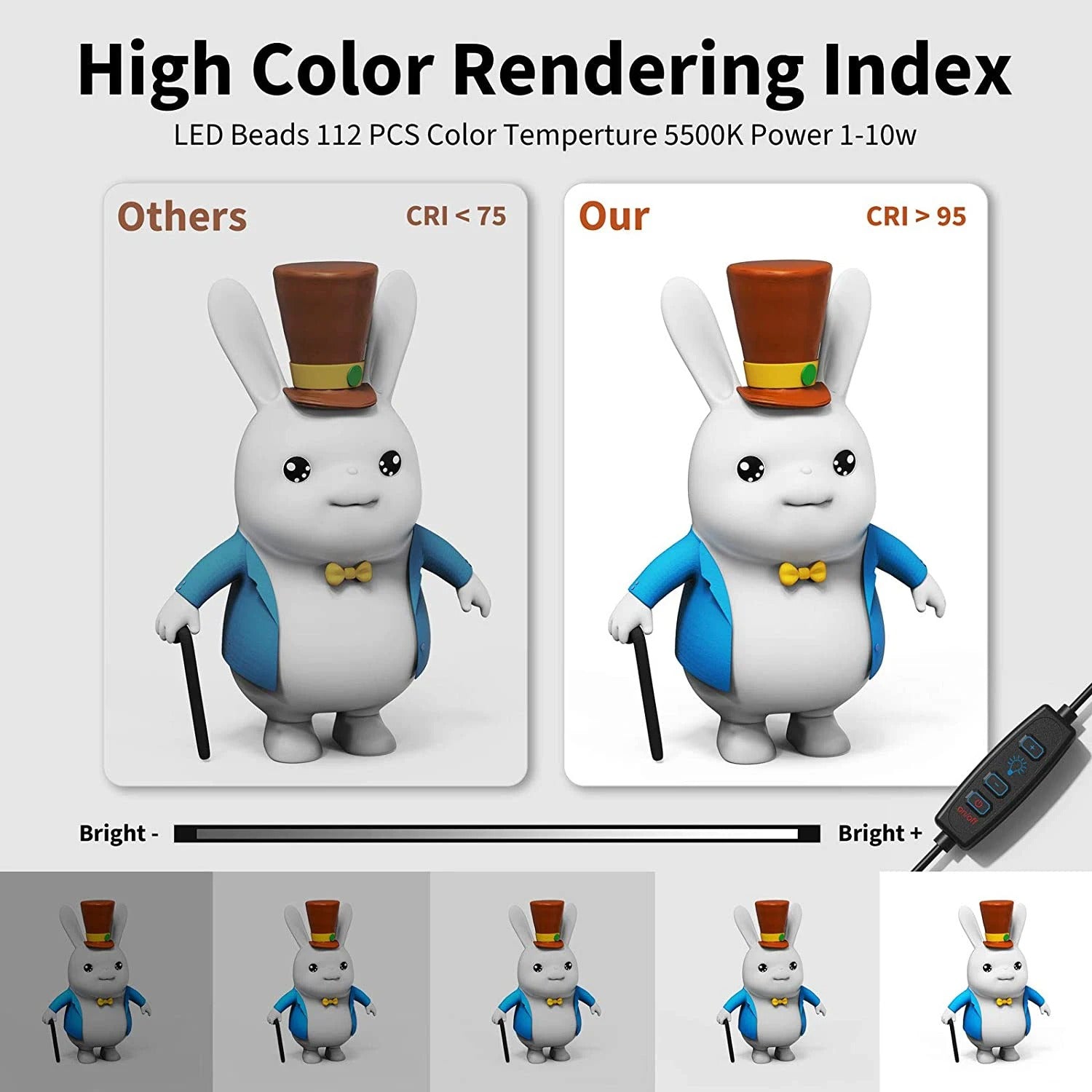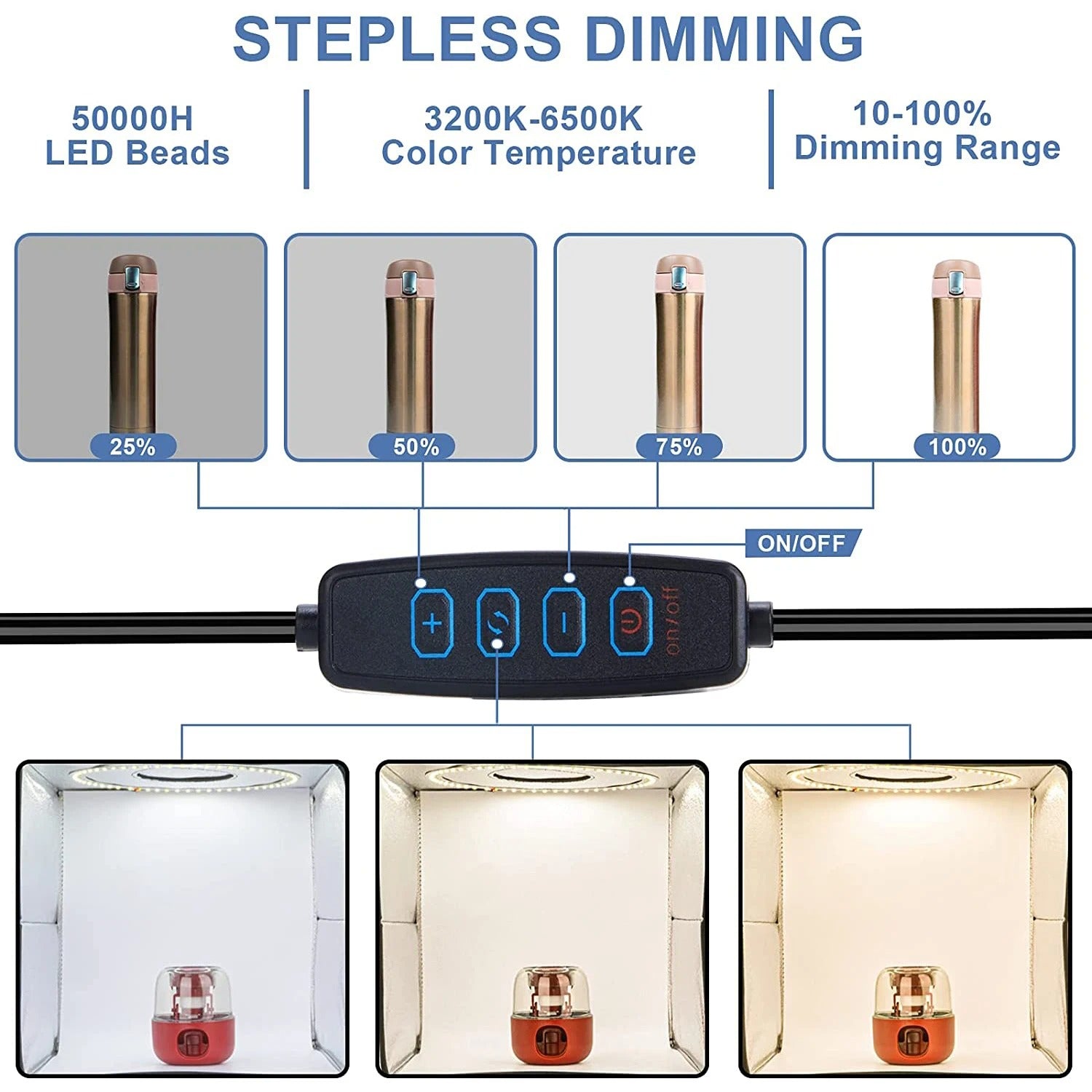 1.Dimming:Integrate 120 high-quality LED light beads with dimmable range 10%-100%, 3200K-6500K color temperature (White/Soft/Warm Light). You can easily adjust the brightness to get the desired lighting effect. Perfect for shooting small items such as jewelry, accessories, toys, watches, gadgets and other items.