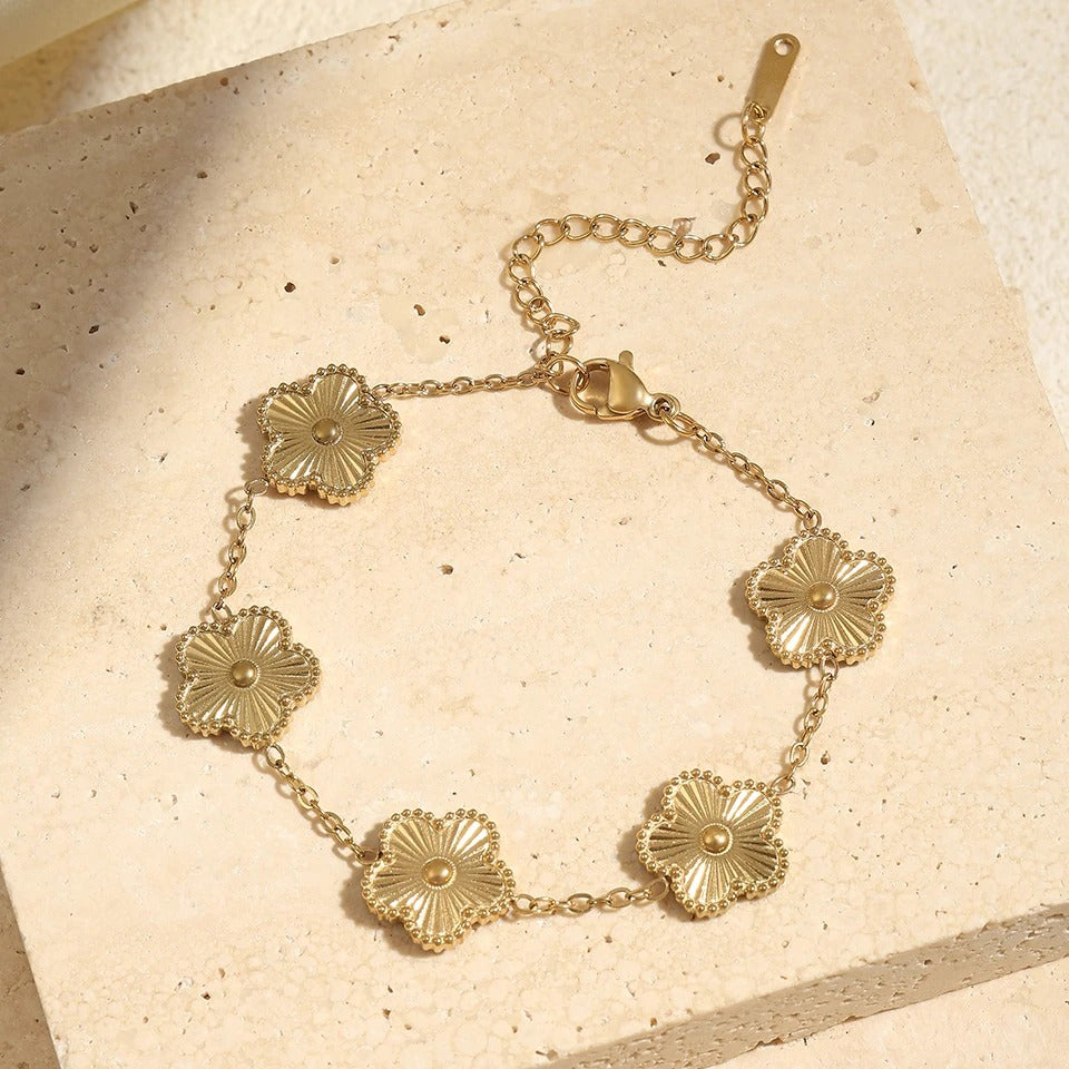 Elevate your accessory collection with this set of three gold-colored stainless steel bangles, expertly crafted for durability and style. Each bracelet features a geometric five-leaf flower design inlaid with sparkling zircon stones, adding refined elegance to any outfit. Perfect as a thoughtful gift or a sophisticated addition to your own jewelry box, these bangles combine modern aesthetics with lasting quality.