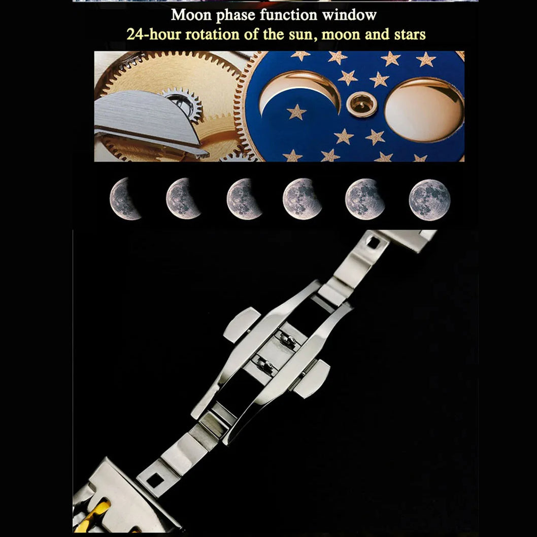 Experience timeless craftsmanship with this Gold Skeleton Men's Watch, featuring a retro design and a sophisticated moon phase tourbillon. Its automatic mechanical movement ensures precision without battery dependence, while the stainless steel band offers durability and a luxurious finish. The luminous hands enhance readability in low light, making it both a functional and elegant accessory for the discerning wearer.