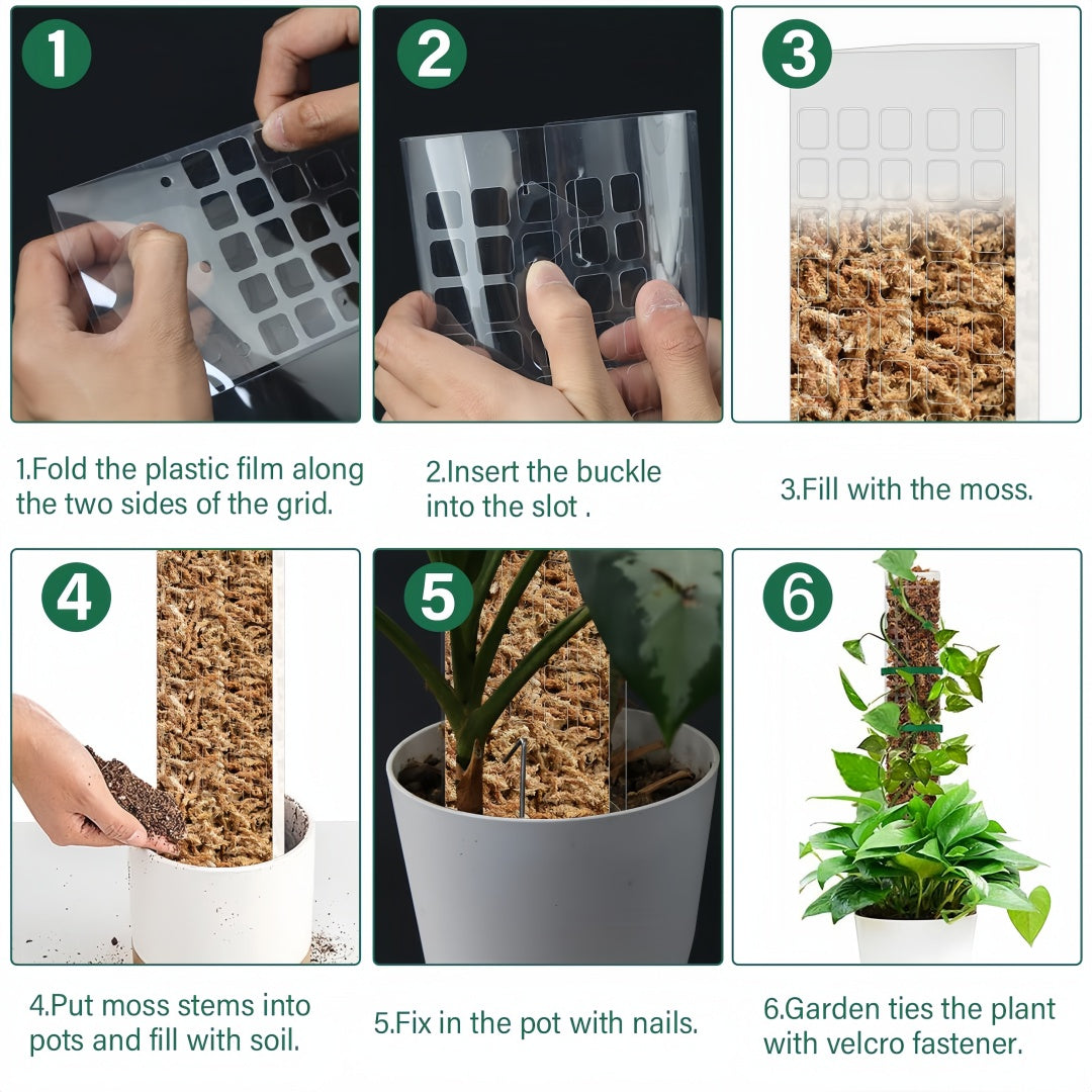 [Easy to install and solid design]: Our plastic moss rods are very convenient and can be easily installed. The moss pole of the plant has two fold lines, which are folded along the folding line to form a semicircular (D -shaped) moss. Do not roll it directly into cylindrical! Fill it with moss, insert it into the ground around the plant stems, fix the stems with garden tie, and then insert the ground wooden stake.