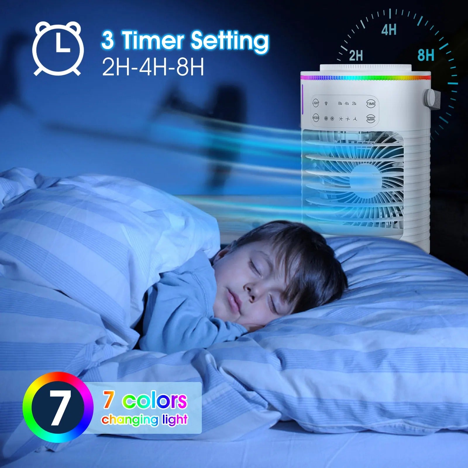 This Portable Air Conditioner Mini Air Cooler offers efficient cooling with a 600ml water tank that uses ice water to lower air temperature. Powered via USB, it provides convenient, energy-saving operation ideal for personal spaces. Its compact design ensures easy portability, making it perfect for desks, bedrooms, or small rooms where targeted cooling is needed.