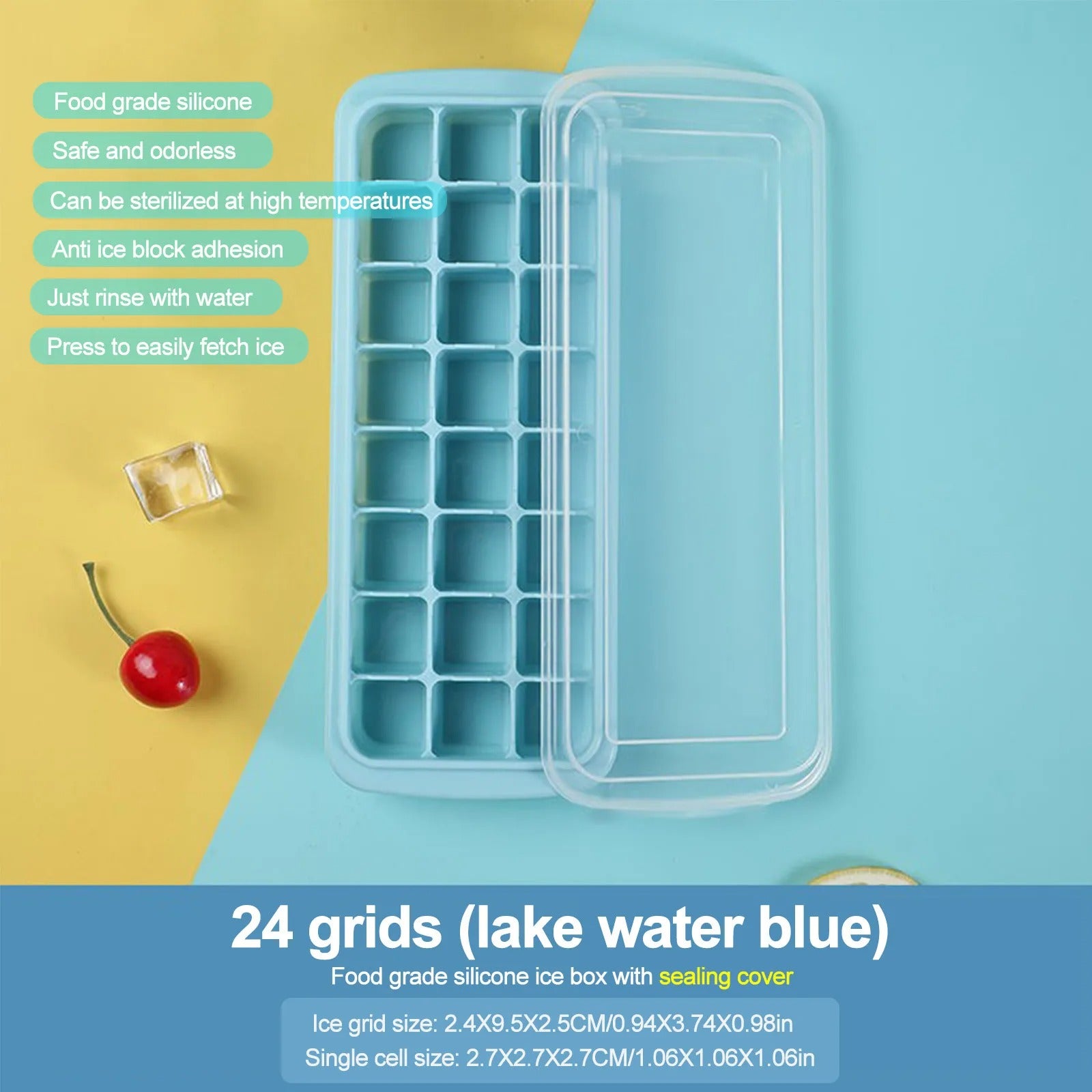 This silicone ice cube tray features 24 individual cubes and comes with a secure lid to prevent spills and odors. Designed for easy release, its flexible material allows you to pop out ice or jelly cubes effortlessly. Ideal for freezing water, juices, or making homemade jelly, this tray combines convenience with durability for expert-level kitchen use.